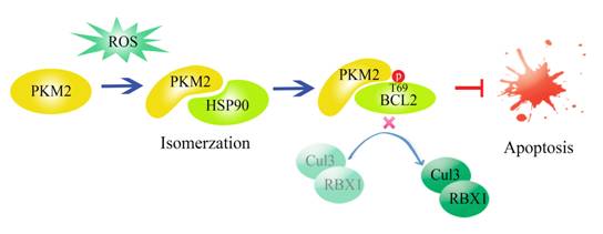 ? ? 腫瘤細(xì)胞中,氧化壓力刺激PKM2在HSP90的幫助下發(fā)生異構(gòu)化,同時(shí)轉(zhuǎn)移到線粒體上,通過磷酸化Bcl2的第69位蘇氨酸,阻斷Cul3-RBX1與Bcl2的結(jié)合,從而穩(wěn)定了Bcl2的蛋白水平,抑制細(xì)胞凋亡。
