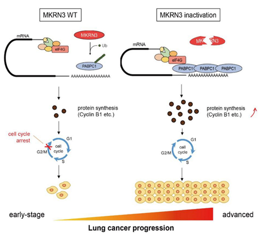 圖:MKRN3失活促進(jìn)非小細(xì)胞肺癌惡性進(jìn)展。(左):MKRN3直接結(jié)合并泛素化其底物PABPC1,抑制RNA識(shí)別模體與信使RNA的3'端多聚A尾部結(jié)合,抑制癌細(xì)胞總蛋白合成從而阻遏細(xì)胞周期;(右):MKRN3失活導(dǎo)致PABPC1泛素化降低,促進(jìn)RNA識(shí)別模體與信使RNA的3'端多聚A尾部結(jié)合,增強(qiáng)癌細(xì)胞總蛋白合成從而加快細(xì)胞周期,促進(jìn)肺癌進(jìn)展。