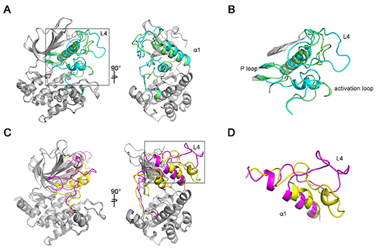 圖:新插入外顯子編碼的Loop(L4)以及相鄰的、受到加速進化影響的P-loop和activation loop的NRK蛋白質結構。