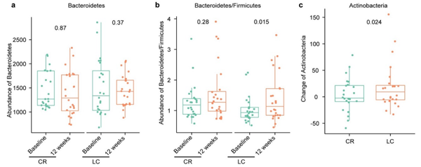 林旭研究組前期在對超重或肥胖女性開展的為期12周的全餐干預研究中,發現低碳水化合物膳食(LC組,40-50%E脂肪,<40%E碳水化合物)與限制能量的傳統高碳水化合物膳食(CR組,55%E碳水化合物,限制35%能量)在減少體重和體脂含量方面具有相似的作用,但僅LC膳食能顯著地改善高密度脂蛋白膽固醇(HDL-C)水平以及總膽固醇/HDL-C和甘油三酯(TG)/HDL-C比例。在此基礎上,李亦學研究組、林旭研究組和曾嶸研究組合作,進一步對48名超重或肥胖女性的基線和12周干預后的腸道宏基因組、血液紅細胞膜脂肪酸及血漿酰基肉堿進行了檢測。馬一瑋博士、孫怡迪博士和孫亮副研究員經過系統性的分析,首次發現不同減重膳食干預導致兩組志愿者的腸道菌群結構和功能、宿主血液脂肪酸和酰基肉堿水平的差異性變化。在12周的干預后,LC組的擬桿菌門/厚壁菌門比例顯著增高(P = 0.015),而CR組僅存在增高趨勢(圖1b)。在菌群功能的變化方面,與CR組相比,LC組的支鏈氨基酸合成通路被抑制,而絲氨酸合成通路上調。在紅細胞膜脂肪酸水平方面,與CR組相比,LC組的兩種脂肪酸體內合成途徑上的脂肪酸(14:0和16:1n-7)水平顯著下降,EPA(20:5n-3)水平顯著上升。盡管干預后兩組的血漿酰基肉堿水平均普遍上升,LC組的短鏈酰基肉堿水平有更多的提升。經過逐步回歸分析,發現一系列菌群共豐度基因簇(CAG)、脂肪酸和酰基肉堿的變化均與血脂改善顯著相關。值得注意的是,與脂肪酸和酰基肉堿的變化相比,菌群CAG變化對升高HDL-C水平(81.6%)和降低TG水平(89.3%)均有更大的貢獻度(圖2)。因此,本研究提示,在超重或肥胖的中國女性中,膳食模式干預導致的菌群結構的改變比宿主脂肪酸相關代謝的改變對于血脂改善的貢獻度更大。總之,本研究為揭示膳食模式干預引起的腸道菌群和人體代謝物改變,及其與代謝標記物變化之間的聯系提供了新的證據,為解讀膳食-菌群-宿主間的復雜交互作用提供了有價值的參考。