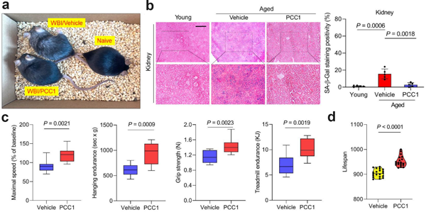 研究人員隨后在多種小鼠模型中論證PCC1清除體內(nèi)衰老細(xì)胞的有效性和安全性,結(jié)果證明在自然衰老的老年小鼠模型中,PCC1能清除老年小鼠多種組織器官類型中的衰老細(xì)胞,增強小鼠生理機能并延長老年小鼠壽命。