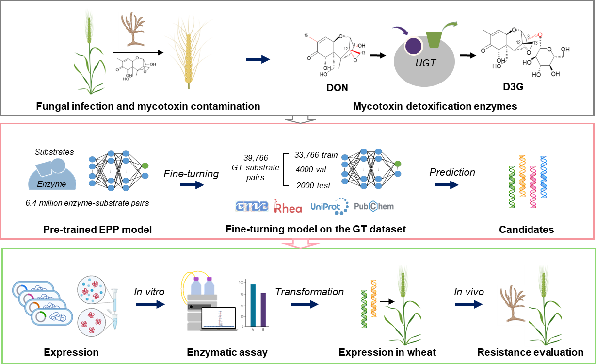 研究團(tuán)隊(duì)開(kāi)發(fā)了專門用于糖基轉(zhuǎn)移酶(GTs)底物雜泛性預(yù)測(cè)的深度學(xué)習(xí)模型EPP-GT,該模型整合了來(lái)自GTDB、Rhea和RxnFinder等多個(gè)數(shù)據(jù)庫(kù)的酶-底物配對(duì)數(shù)據(jù),采用圖神經(jīng)網(wǎng)絡(luò)結(jié)合注意力機(jī)制的計(jì)算模擬方法,實(shí)現(xiàn)對(duì)糖基轉(zhuǎn)移酶催化功能的高效預(yù)測(cè)。通過(guò)前期模型預(yù)測(cè)和實(shí)驗(yàn)驗(yàn)證,成功挖掘出具有DON降解能力的新型UGTs,其物種來(lái)源分別為酸棗(Ziziphus jujuba)和野生稻(Oryza meyeriana)。體外催化實(shí)驗(yàn)表明這兩種酶能將DON轉(zhuǎn)化為低毒性的D3G,轉(zhuǎn)基因小麥相關(guān)實(shí)驗(yàn)進(jìn)一步證實(shí),表達(dá)新型UGTs的小麥品系表現(xiàn)出對(duì)DON和禾谷鐮刀菌感染的顯著抗性,病害癥狀減輕,毒素積累減少。