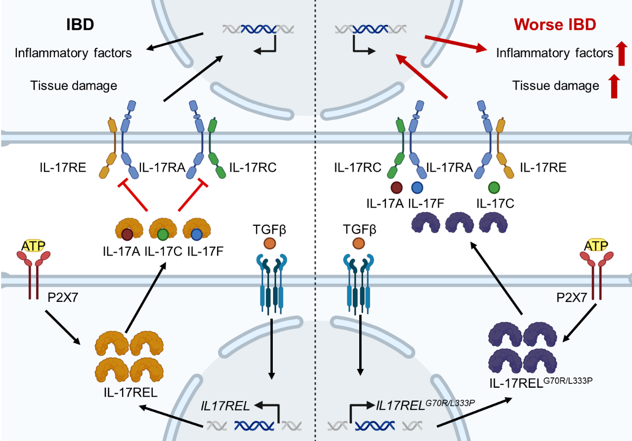研究團隊長期從事IL-17家族細胞因子及其受體的研究,取得一系列研究成果(Nat. Immunol.?2011; Nat. Med.?2012; Immunity?2014, 2015, 2019)。本研究首次鑒定并系統闡明了IL-17家族的誘餌受體IL-17REL,解析了其表達調控機制及免疫功能,并明確其功能性突變是IBD的重要遺傳致病因素之一。這一發現不僅為深入理解IBD的發病機制提供了新的理論框架,也為開發靶向IL-17信號通路的創新治療策略提供了全新的潛在靶點。