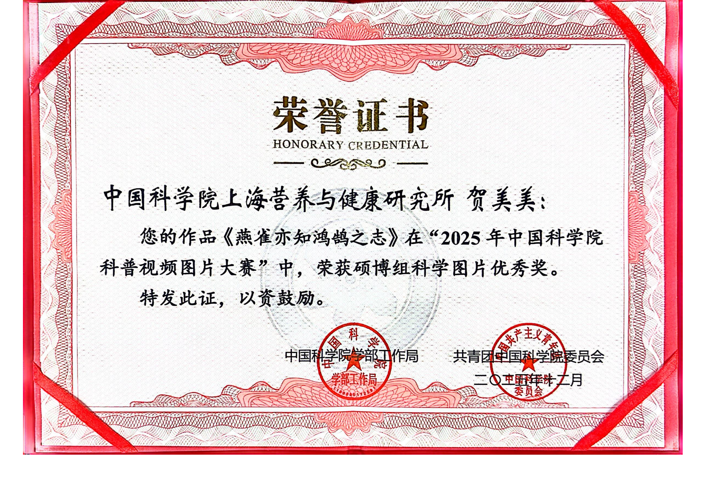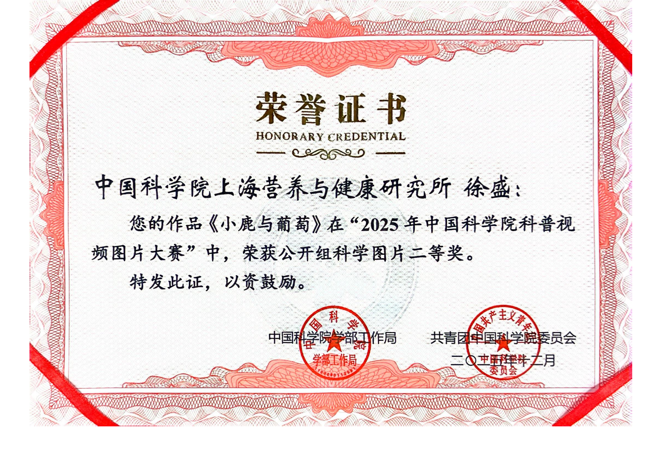 近日,2025年中國科學院科普視頻圖片大賽獲獎名單揭曉,中國科學院上海營養與健康研究所選送的多項科普作品斬獲佳績。其中,博士后徐盛創作的《小鹿與葡萄》榮獲公開組科學圖片二等獎,研究所基于錢友存研究組科研成果創作的《科學家首次揭示“細菌外交官” 精準識菌助力腸道“免疫和平”》榮獲公開組科普視頻三等獎,研究生賀美美創作的《燕雀亦知鴻鵠之志》榮獲碩博組科學圖片優秀獎。